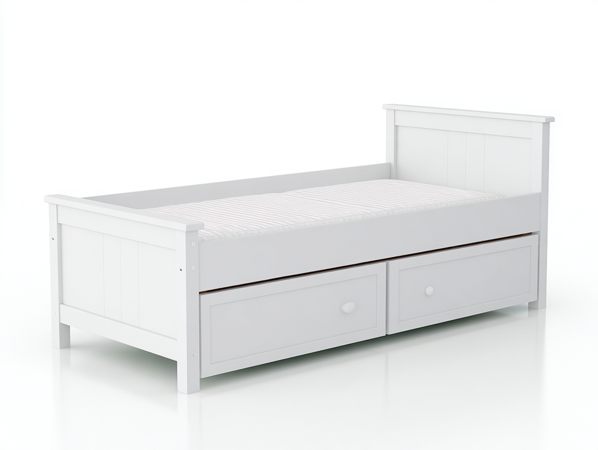 Questo letto singolo con cassetti contenitore è progettato per offrire una soluzione pratica e funzionale nella camera da letto. La struttura compatta permette di sfruttare lo spazio sotto il letto per l’organizzazione di biancheria o accessori della stanza. Il colore bianco e il design lineare rendono il letto facile da abbinare a diversi stili di arredamento domestico.