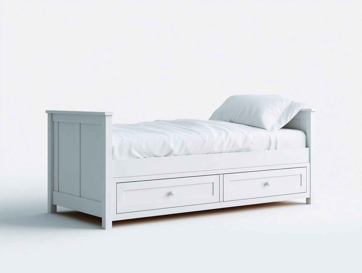 La struttura del letto è realizzata in legno con finitura bianca. I pannelli della testiera e della pediera presentano una lavorazione semplice che contribuisce alla stabilità e alla resistenza durante l’utilizzo quotidiano. La superficie liscia consente una pulizia pratica e una manutenzione semplice.